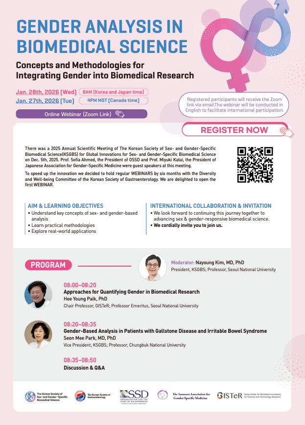 이에 세계 성차의학 학술 네트워크와의 연계를 강화하고 글로벌 혁신을 가속화하기 위해 OSSD, JAGSM 그리고 대한소화기학회 다양성삷의질위원회와 함께 2026년 1월 28일 오전 8시에 온라인 ZOOM 으로 "GENDER ANALYSIS IN BIOMEDICAL SCIENCE_Concepts and Methodologies for Integrating Gender into Biomedical Research" 웨비나를 개최합니다.